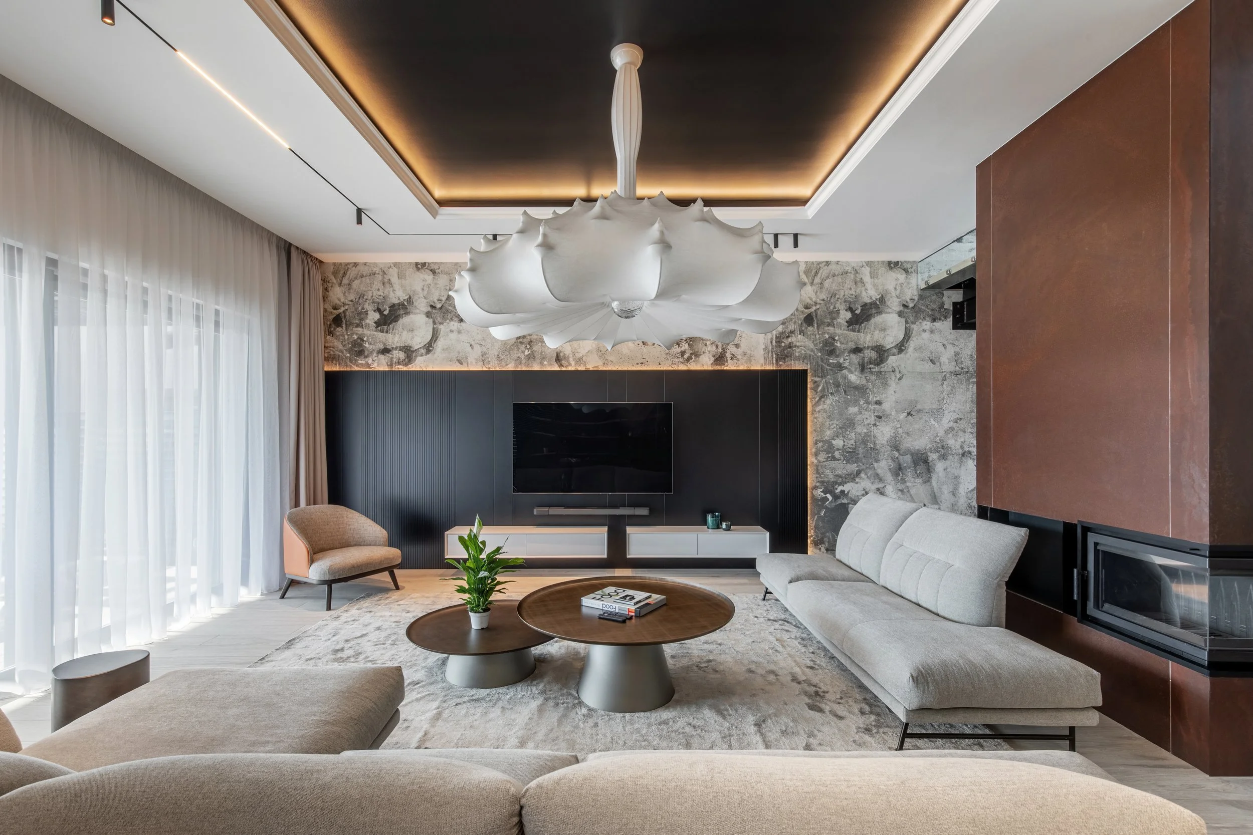 Zona de living, nucleul acestei case, este un exemplu perfect al stilului modern eclectic. Mobilierul confortabil, texturile variate și accentele cromatice subtile au fost selectate pentru a crea un spațiu primitor, dar sofisticat. Fiecare detaliu – de la finisajele de înaltă calitate la piesele decorative unicat – contribuie la un design care se simte cald și contemporan.